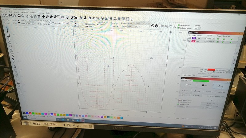 Měřítko 1:48 se mi zdá vhodné, i když model bude již dost velký a zabere hodně místa. Protože vlastním laserovou gravírku Creality Falcon2 o optickém výkonu 20 W a řezné ploše 40 x 40 cm, tak bylo pro mě volbou to, že jsem všechny díly kostry trupu naskenoval a v programu Corel Draw překreslil do křivek, zvětšil na 200% (z měřítka 1:96 do měřítka 1:48) uložil do formátu SVG a pro laserování otevřel v programu Lightburn. Materiál byl šedý strojní kartón o tloušťce 1 mm. Bylo by vhodné použít rovnou dvou milimetrový karton, ale v českých obchodech jsem měl možnost koupit jen 1 mm nebo 3 mm šedý karton. Pro moji gravírku jsem nastavil řeznou rychlost 750 mm/min při 60% výkonu a pro gravírování textu na výřezky jsem nastavil rychlost 6000 mm/min při 20% výkonu. Nejprve jsem v jednom průjezdu gravíroval a druhý průjezd již řezal. V programu Lightburn to jde nastavit do jednoho souboru tak, že co se řeže mají křivky jednu barvu a to co se gravíruje má barvu jinou. Bohužel Lightburn je program za peníze, pokud někdo chce pracovat s laserovou gravírkou v programu zdarma má možnost použít program LaserGRBL a pak musí vytvořit dva nezávisle soubory. Pro ty co nemají zaplacen program Corel Draw je tady i bezplatná varianta a to program Inscape, kterým vytvoříte soubory SVG také. Ale musíte se to naučit, což nějakou dobu zabere.