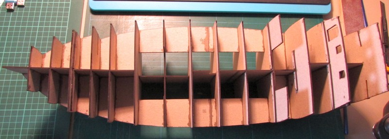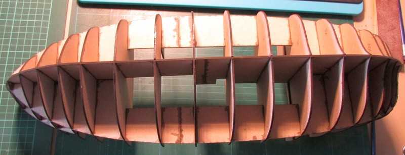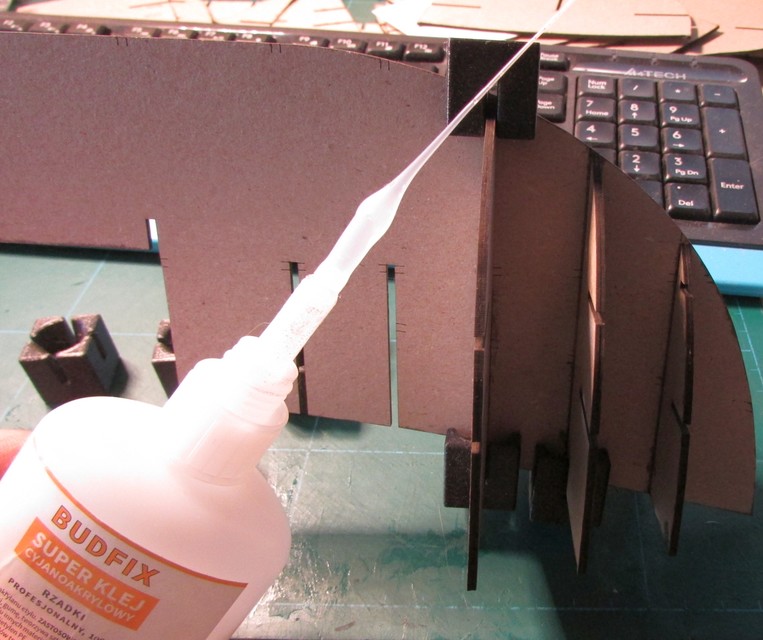 Celý skelet je lepený sekundovým lepidlem a zatím jsem nelepil paluby, které musím překreslit do křivek a opět je vyřežu na laserové gravírce.