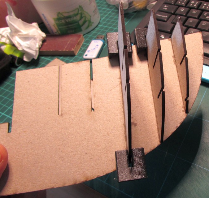 Na stránce polského modeláře kartonowe-hobby.pl jsem viděl 3D tištěné přípravky pro lepení skeletů lodí. Trochu jsem je upravil pro svou potřebu a vytiskl z PLA pro různé tloušťky kartonu. Na fotografiích je vidět jejich použití v případě zájmu poskytnu i soubory STL. Umožňuje mi to lepší fixování dílů do pravého úhlu a zároveň i přidává mi chybějící třetí ruku.